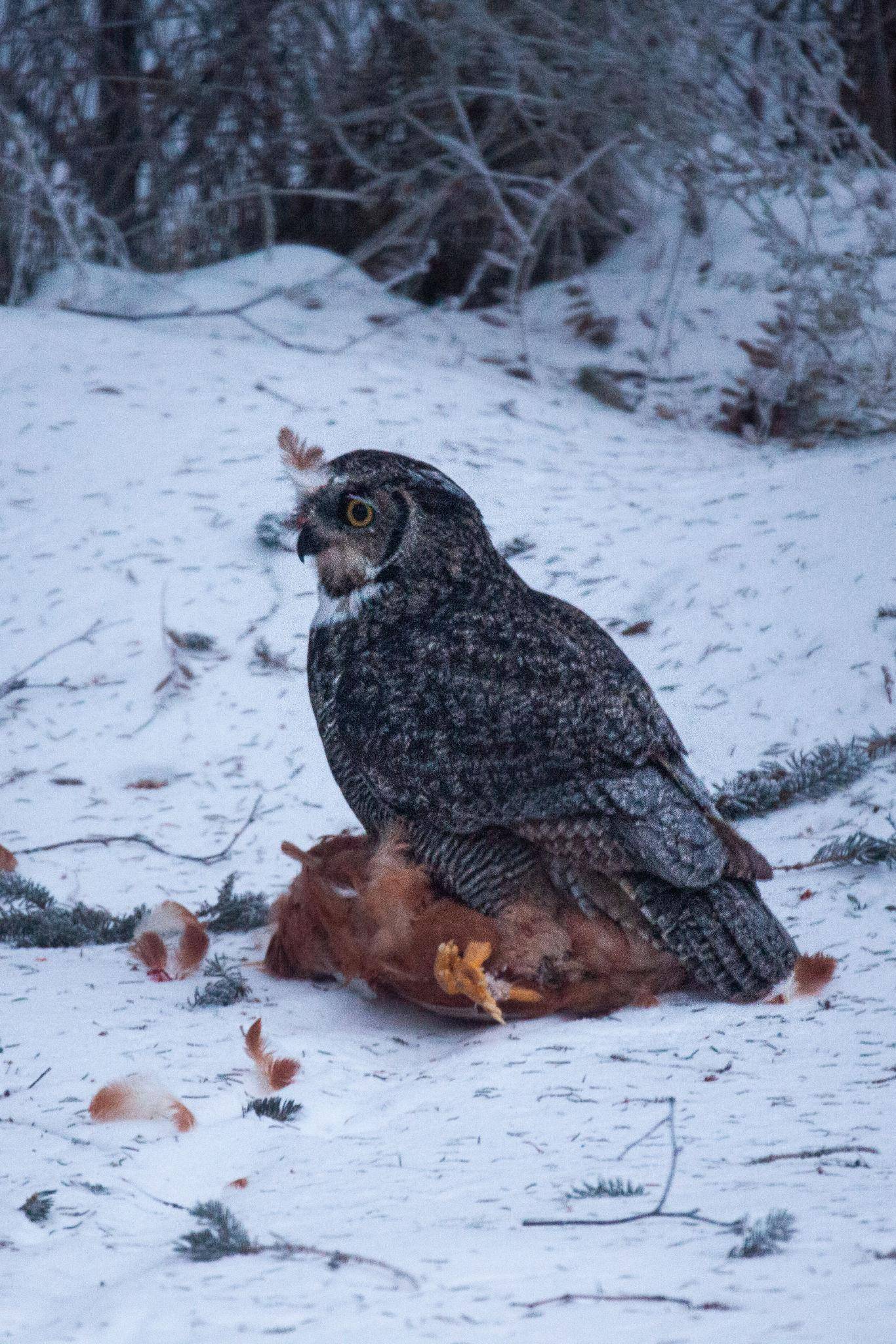 When feeding on larger animals like skunks, rabbits, or even opossums, a great horned owl may remove and discard the head before consuming the body. The skull contains less muscle and fewer calories compared to the torso and hindquarters. By separating it, the owl focuses on the most energy-rich parts of the carcass, breast meat and major muscle groups, which are especially important during cold months when caloric demand is high.